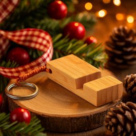 Minimalistische sleutelhanger van bamboe die in één beweging verandert in een stabiele telefoonstandaard - perfect voor op je bureau en onderweg.